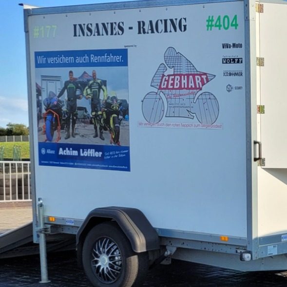 Zusätzlich zum Motorrad ist der Einsatz des Rennanhängers eine effektive Methode, um die Sichtbarkeit von Sponsoren zu erhöhen. Der Anhänger begleitet mich zu allen Messen, Veranstaltungen und Rennen und fungiert als mobile Werbefläche.